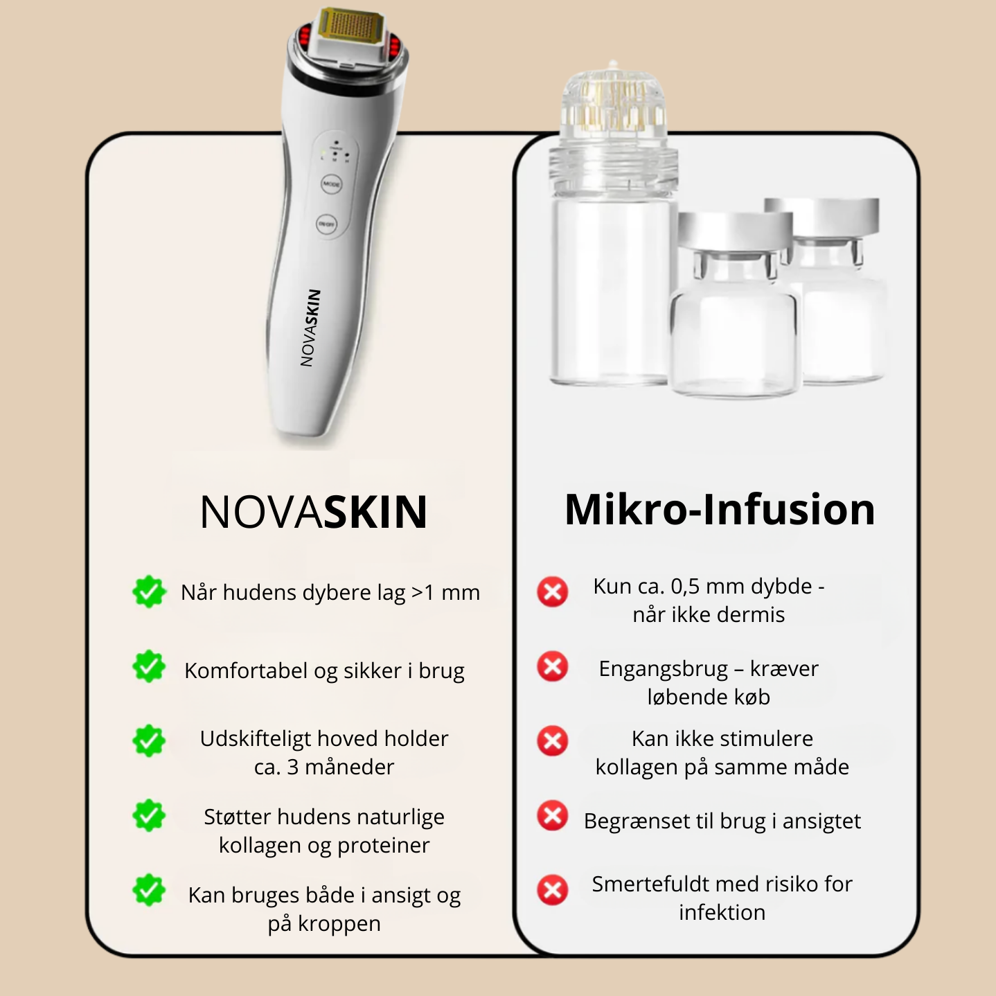 Drop de hurtige løsninger – vælg en teknologi, der både giver synlige resultater her og nu, og holder i længden. NOVASKIN arbejder dybt i huden, hvor rødlys og mikro-infusion slet ikke kan nå.